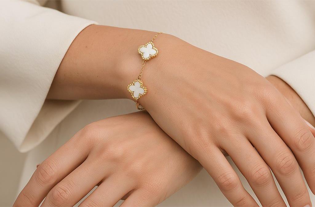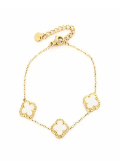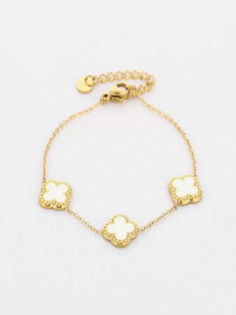 Elegante roestvrijstalen armband in goudkleur, versierd met witte klavertjes voor een speelse en stijlvolle touch. Perfect voor elke gelegenheid!