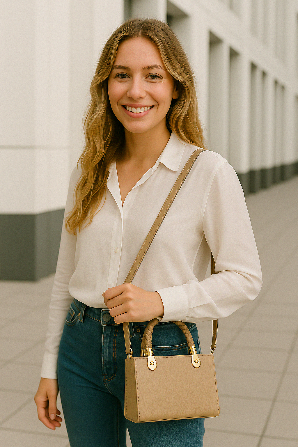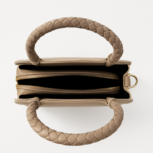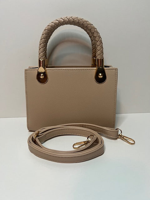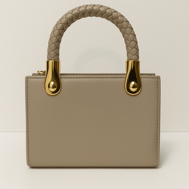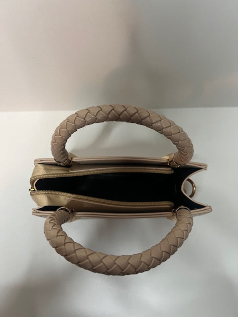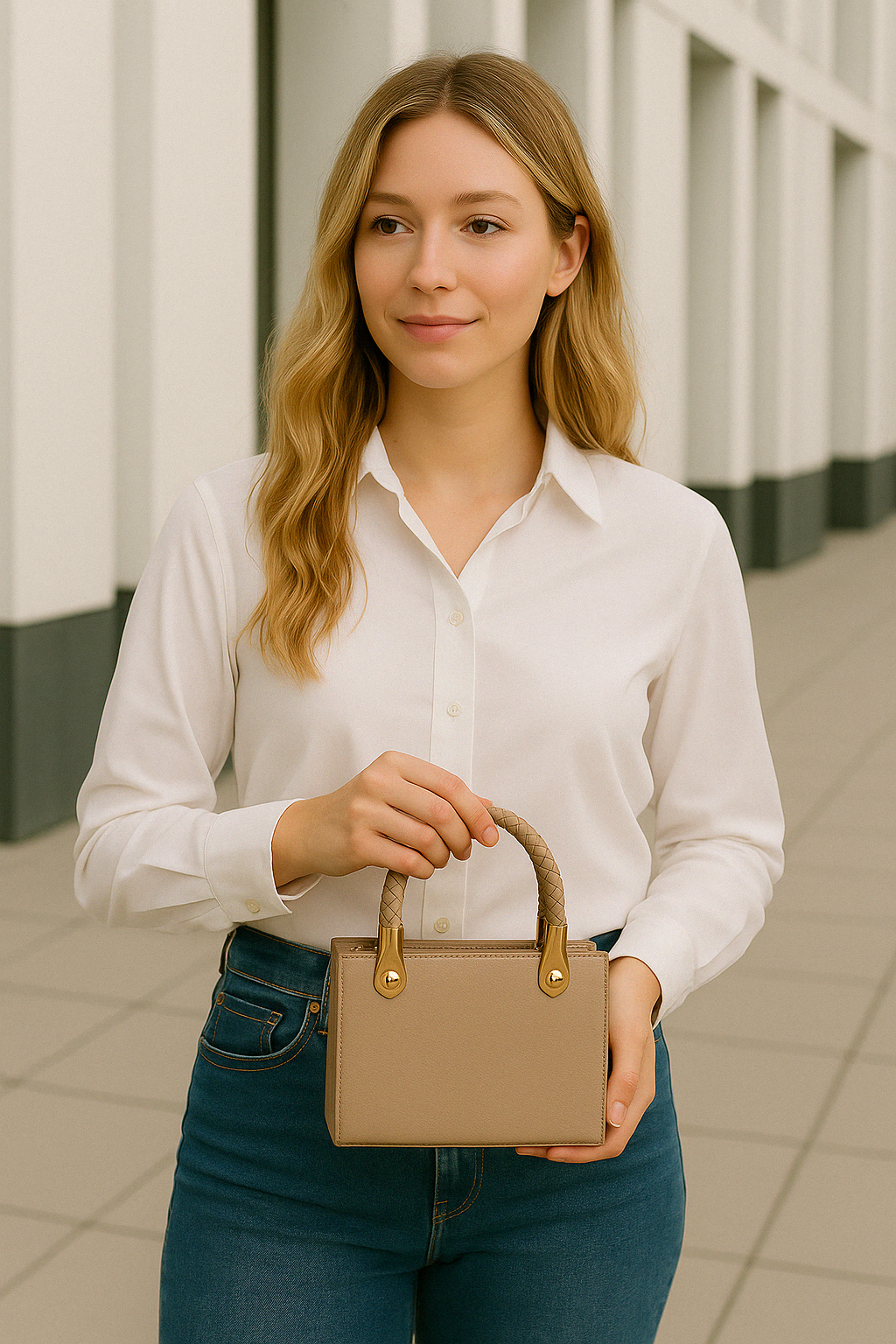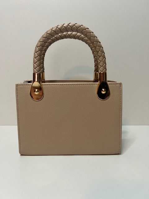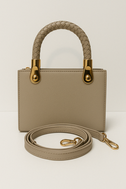 Deze stijlvolle handtas is vervaardigd uit hoogwaardig kunstleer en combineert een compacte vorm met een luxe uitstraling. De gevlochten handgrepen in combinatie met goudkleurige details zorgen voor een chique en moderne look. Met een formaat van 18 x 13 x 8 cm is deze tas perfect voor dagelijkse essentials, en perfect voor een festival.